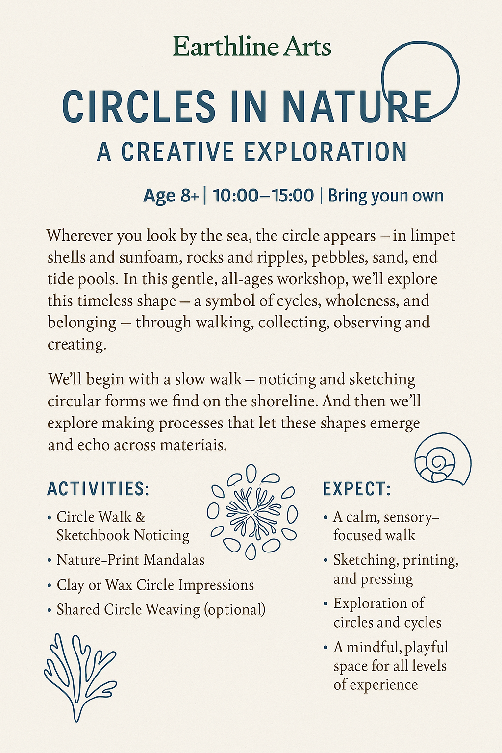 Wherever you look by the sea, the circle appears - in limpet shells and seafoam, rocks and ripples, pebbles, sand and tide pools. In these gentle, all ages, workshop, we’ll explore this timeless shape - a symbol of cycles, wholeness and belonging - through walking, collecting, observing and creating…